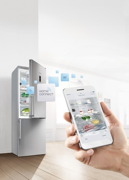 Zuhause sein ohne zuhause zu sein: Waschmaschine oder Backofen lassen sich bequem von unterwegs aus steuern. Und der Kühlschrank erlaubt aus der Ferne nicht nur einen Blick in sein Inneres, sondern informiert auch von sich aus – z.B., wenn seine Tür versehentlich nicht geschlossen wurde. Mit dem Bosch Kühlschrank mit zwei integrierten Innenraumkameras zücken Sie einfach Ihr Smartphone und sehen nach, was sich noch im Kühlschrank befindet. Die Kameras sind wasserdicht und gegen Fruchtsäure resistent. Die Übertragung auf’s Smartphone geschieht verschlüsselt.